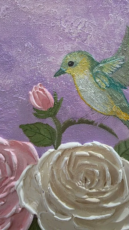 My pieces are built with palette-knife layers and pastel tones, reflecting hope, calm and gentle beauty.
